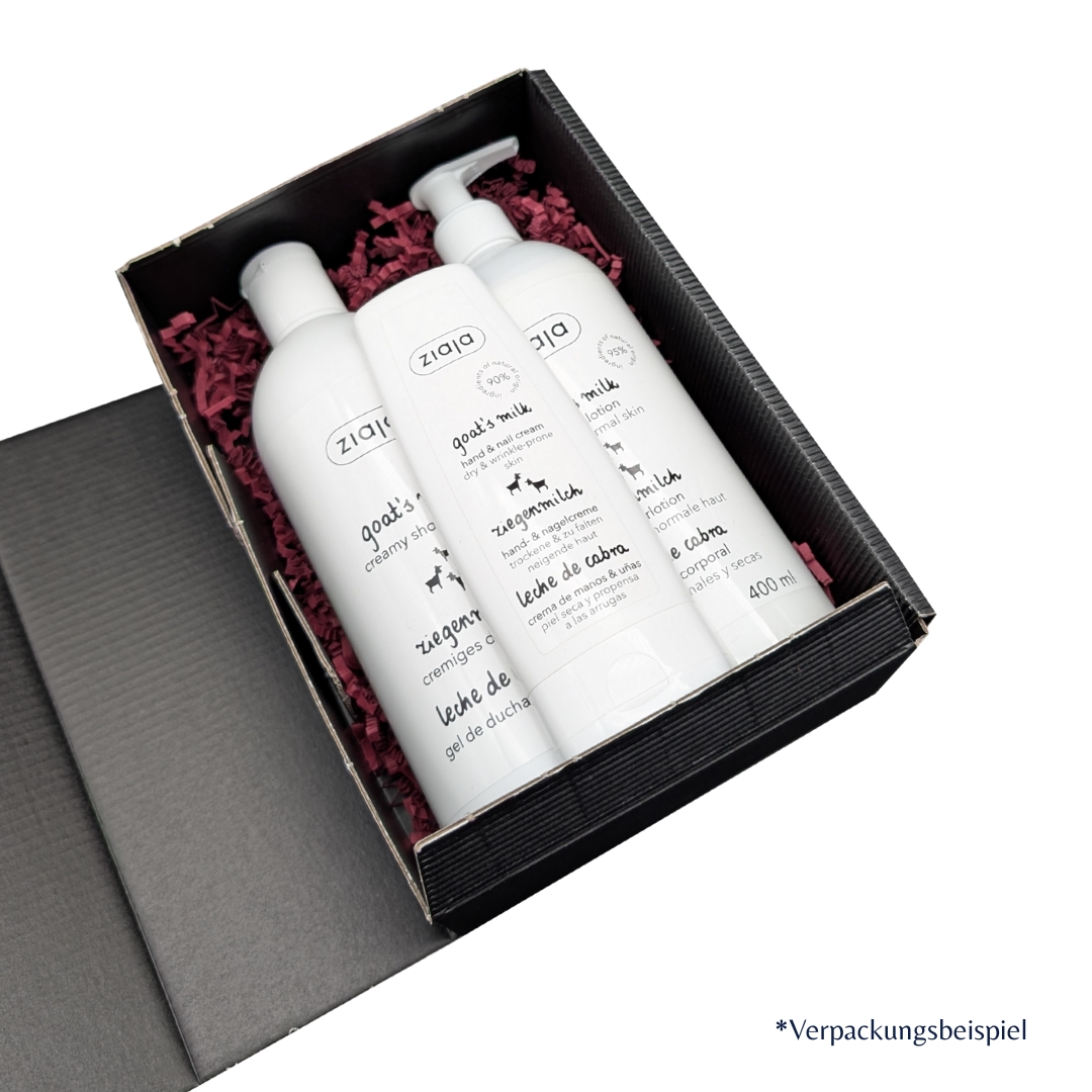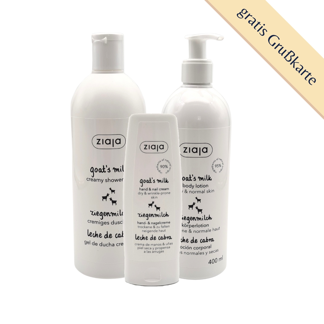 Verwöhnen Sie Ihre Haut mit unserem pflegenden Körperpflegeset mit Ziegenmilch. Das Set enthält ein sanft reinigendes Duschgel, eine reichhaltige Body Lotion und eine schützende Hand- und Nagelcreme – die perfekte Kombination für geschmeidige, gepflegte Haut von Kopf bis Fuß. Ideal als Geschenk oder um sich selbst eine besondere Auszeit zu gönnen.